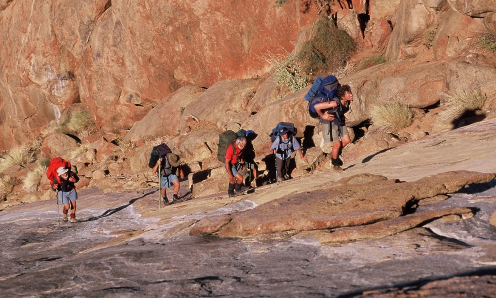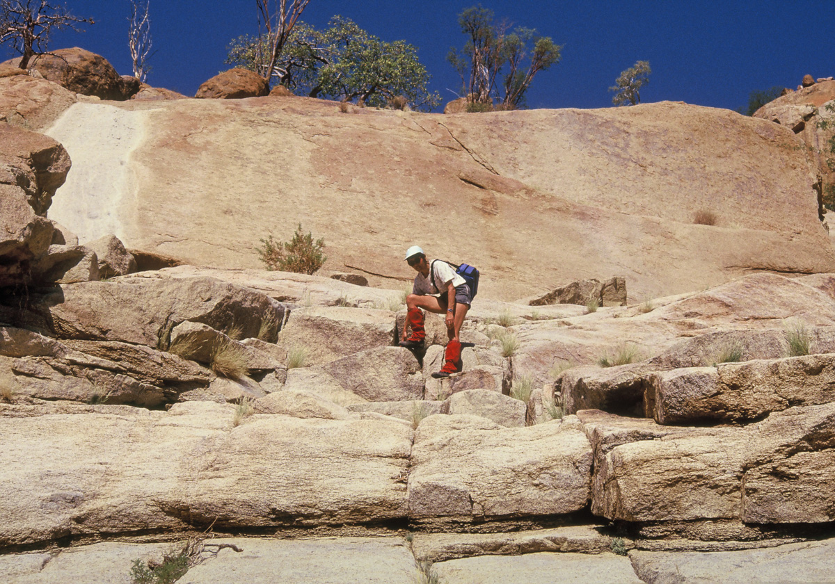 We drove to the base of the mountain in two rugged, high clearance vehicles belonging to expedition members. Ottie had a rough sketch map of our route that she had obtained from climbing friends and Tharina knew the route reasonably well as she had been here before. The camp spot they had chosen for us was at Longipoolies, one of few possibilities with access to water. Rainfall is sparse, but when it occurs, runoff is rapid as the rocky plateau holds almost no soil. At Longipoolies, fast flowing water has worn deep potholes in the rock which retain fresh water that we were able to use while camping there.