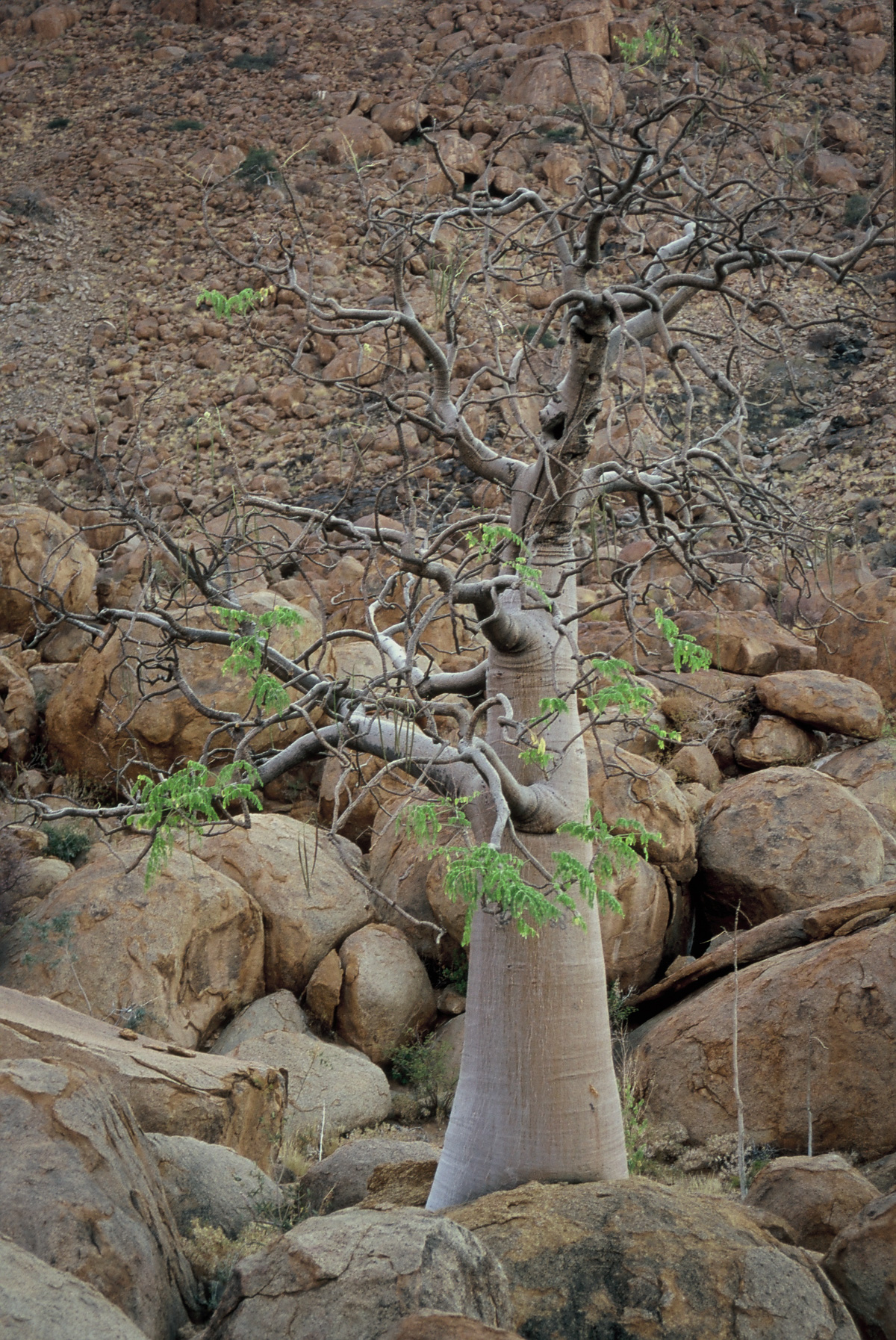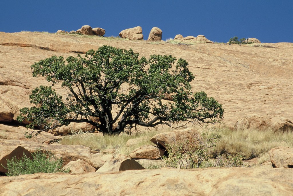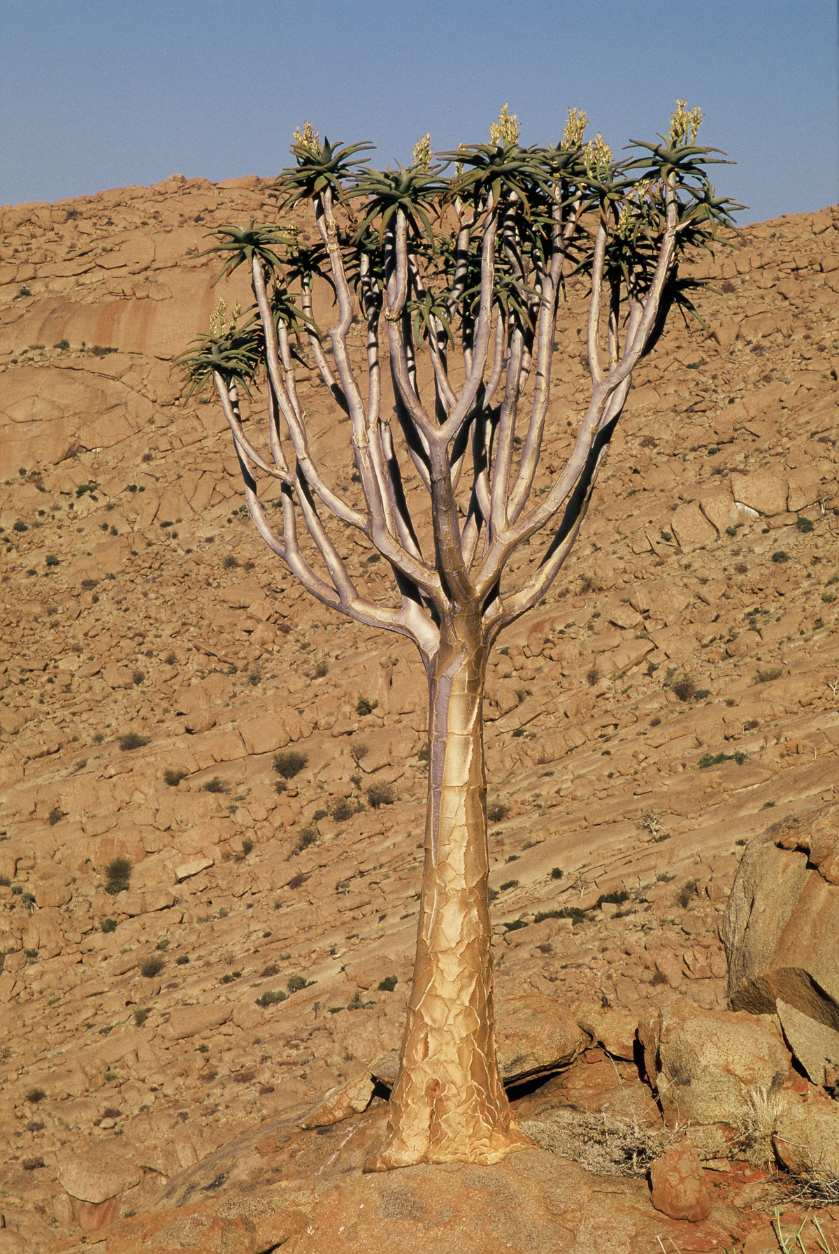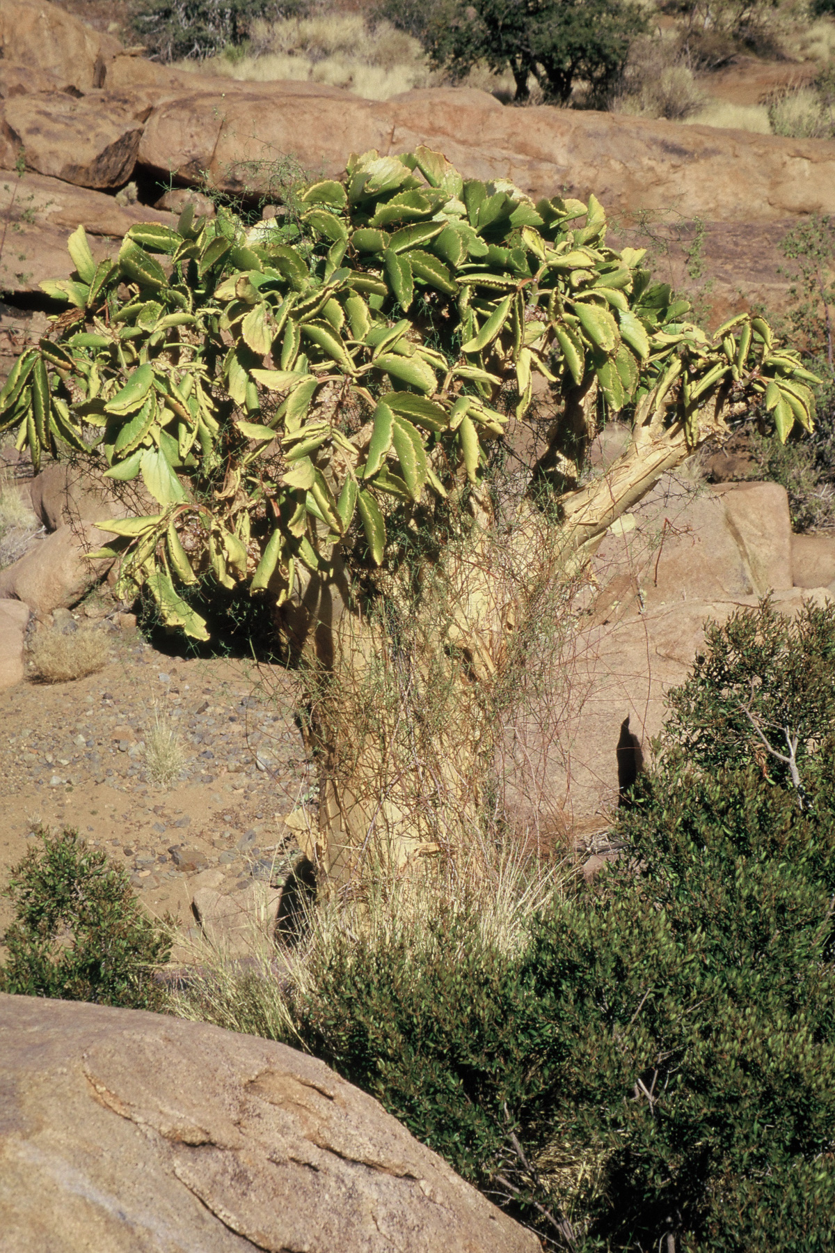 The kokerboom tree for which the kloof is named, is beautifully adapted to its desert habitat. Known also as the quiver tree, Aloidendron dichotomum is a succulent. It grows well in sandy and rocky soil, storing water in its thick trunk and leathery foliage.