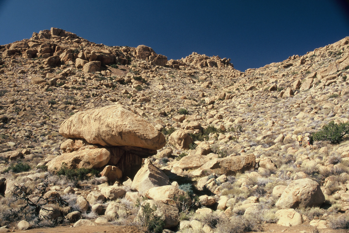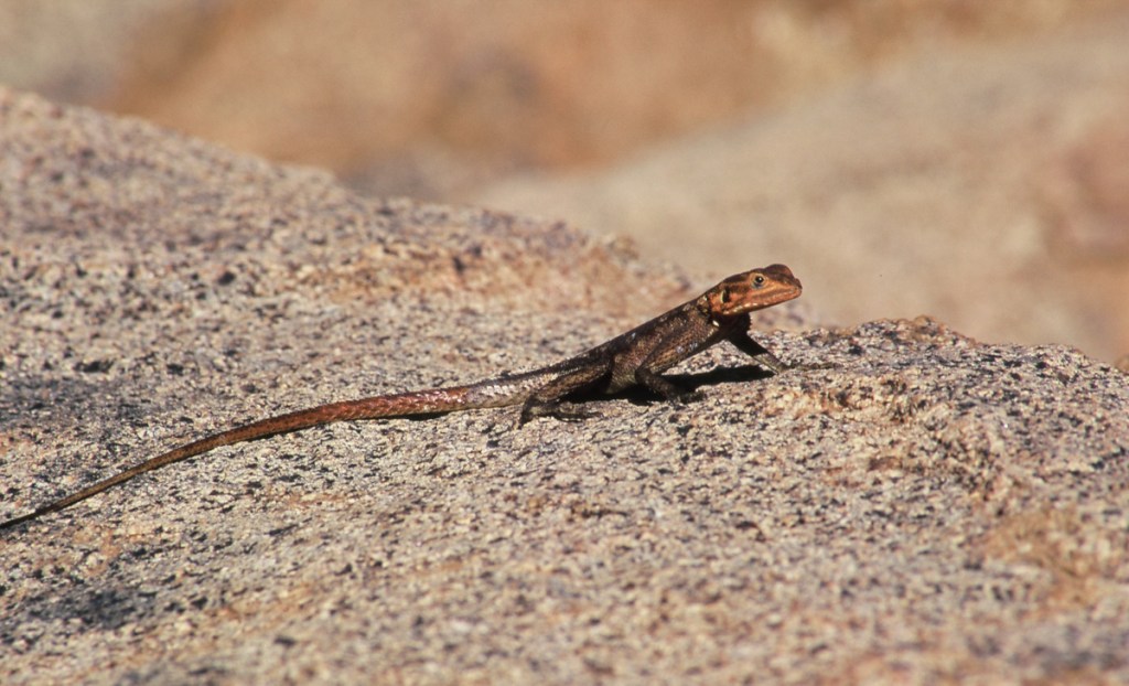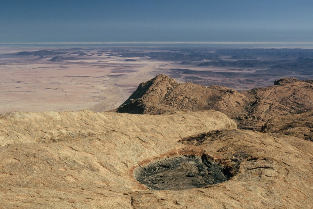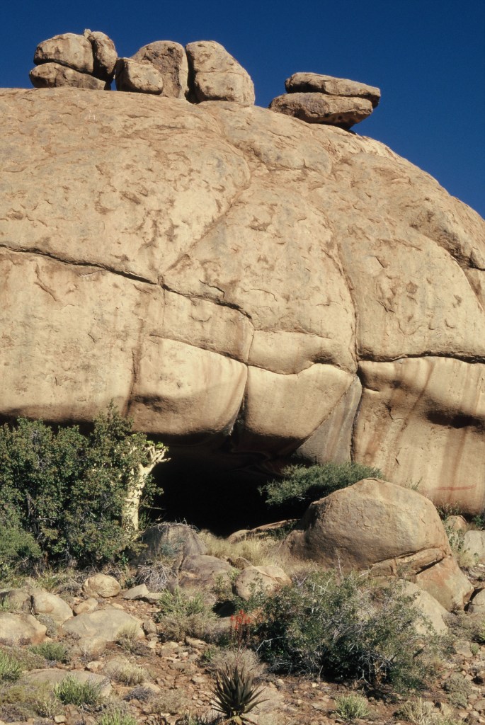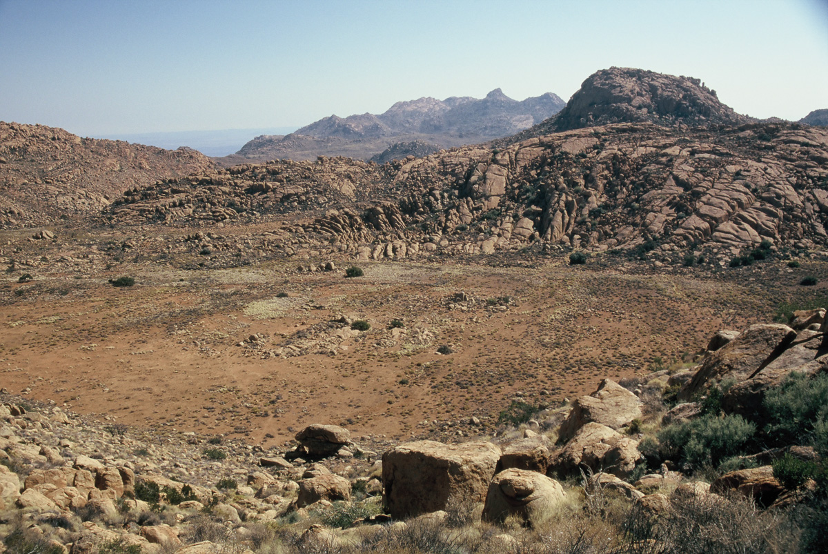 Our group of biologists had several days to explore the area. We hiked to Orabes Kopp through granite country traversing slabs of varying angles, scrambling over huge boulders, and following fissures between rock walls that sometimes became so narrow we were forced to retreat and climb a wall instead. Along the way, we noted and photographed unfamiliar plants and poked into cracks and crevices for signs of life. In that way it was easy to spend the entire day getting there. Views over the Namib desert were spectacular as Orabes Kopp lies near the edge of the plateau.